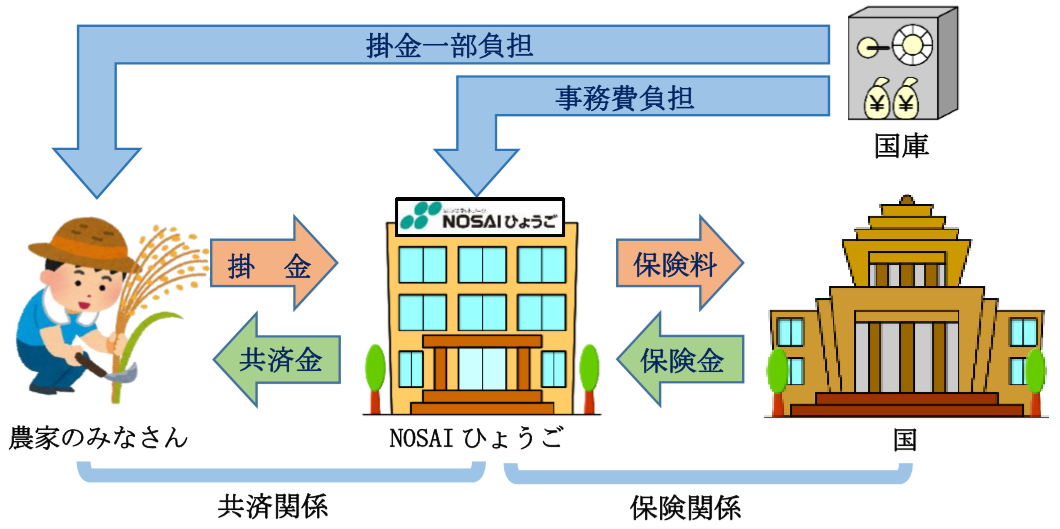 兵庫県では令和2年4月に1県1組合化体制になりましたので、農業共済組合・政府の2段階で運営されています。